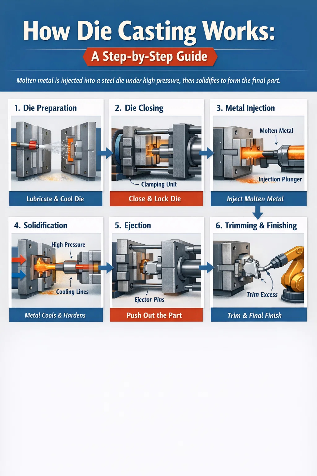 Druckguss ist ein Metallumformungsprozess, bei dem geschmolzenes Metall unter hohem Druck in eine gehärtete Stahlform – eine sogenannte Matrize – eingespritzt und dort gehalten wird, bis das Metall in der exakten Form des Hohlraums erstarrt. Sobald es fest ist, öffnet sich die Matrize, Auswerferstifte drücken das Teil heraus und der Zyklus beginnt von vorne. Ein einzelner Stempel kann diesen Ablauf Hunderttausende Male wiederholen, bevor er verschleißt.
