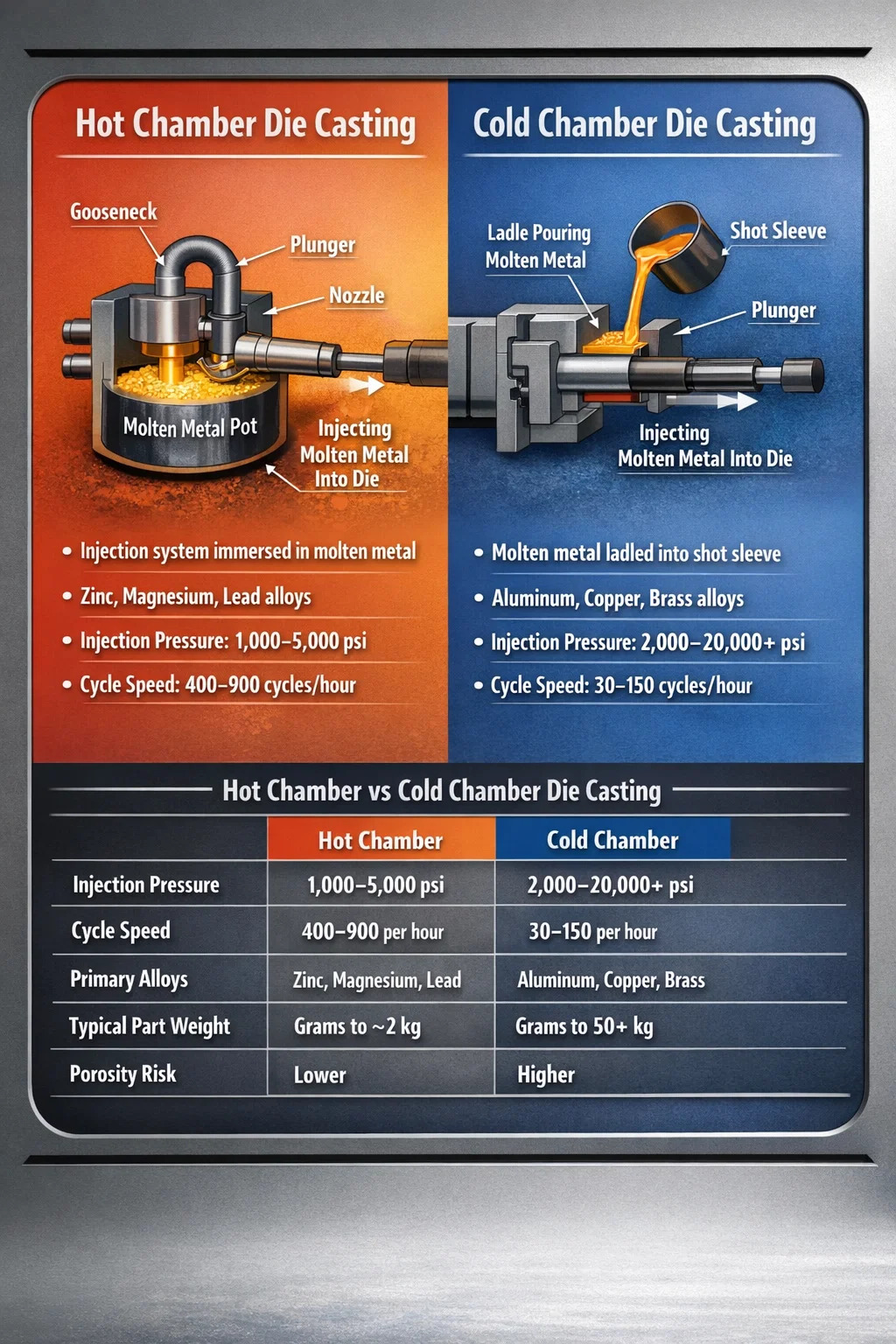 Die beiden grundlegenden Methoden des Druckgusses sind Warmkammer-Druckguss und Kaltkammer-Druckguss . Diese beiden Verfahren haben das gleiche grundlegende Ziel – geschmolzenes Metall unter hohem Druck in eine gehärtete Stahlform zu drücken, um präzise, wiederholbare Teile herzustellen –, unterscheiden sich jedoch erheblich in der Art und Weise, wie das Metall geschmolzen, gehandhabt und eingespritzt wird. Die Wahl der falschen Methode für Ihre Legierung oder Teilegeometrie kann zu schlechter Füllung, übermäßiger Porosität, vorzeitigem Formverschleiß und kostspieligen Ausschussraten führen. Das Verständnis der Unterschiede zwischen diesen beiden Methoden ist der Ausgangspunkt für jede ernsthafte Druckgussentscheidung.