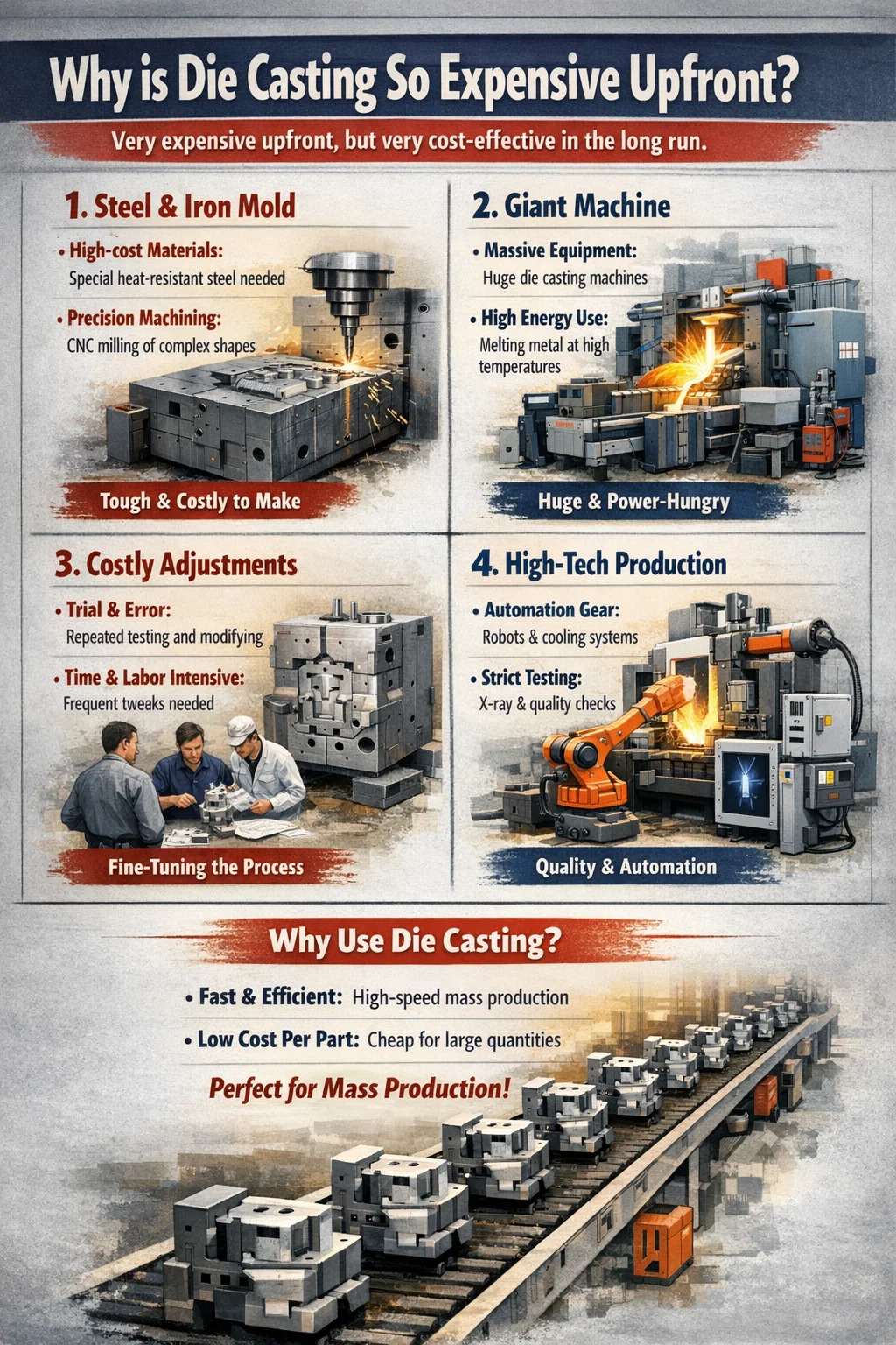 Tatsächlich, Druckguss ist in der Tat ein Prozess, der „im Vorfeld sehr teuer, auf lange Sicht aber sehr kostengünstig“ ist. Die hohen Kosten spiegeln sich vor allem in der Anfangsinvestition wider. Wir können diesen Prozess aufschlüsseln:
